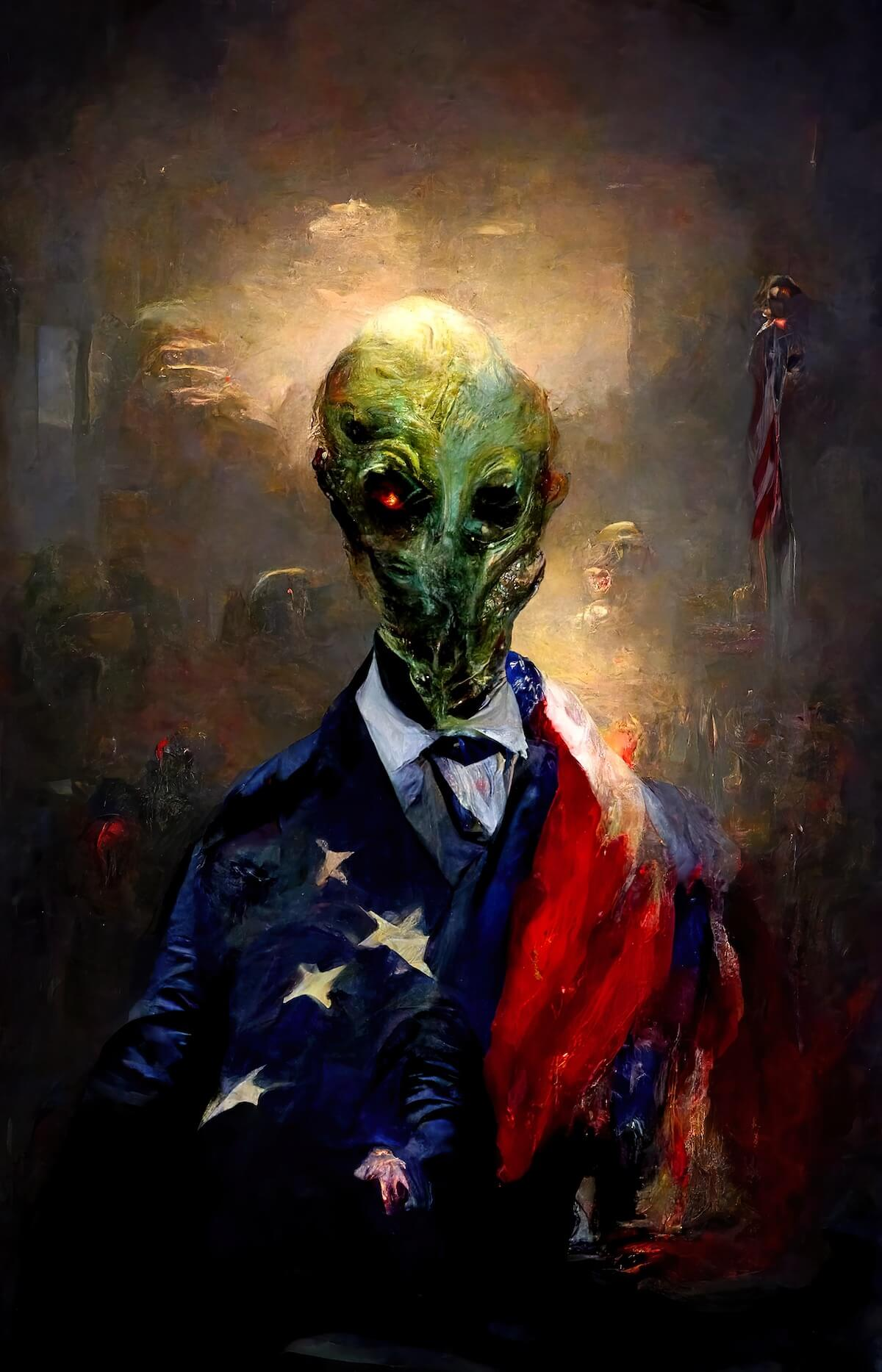 "I had this idea for a timeline. Let me show something really out of place," he says. "What if I took an alien invasion and cataloged it through an impressionist lens. This became my series 'The Truth,' an impressionist painter witnesses an alien invasion. He paints what he sees and chronicles it in his journey."